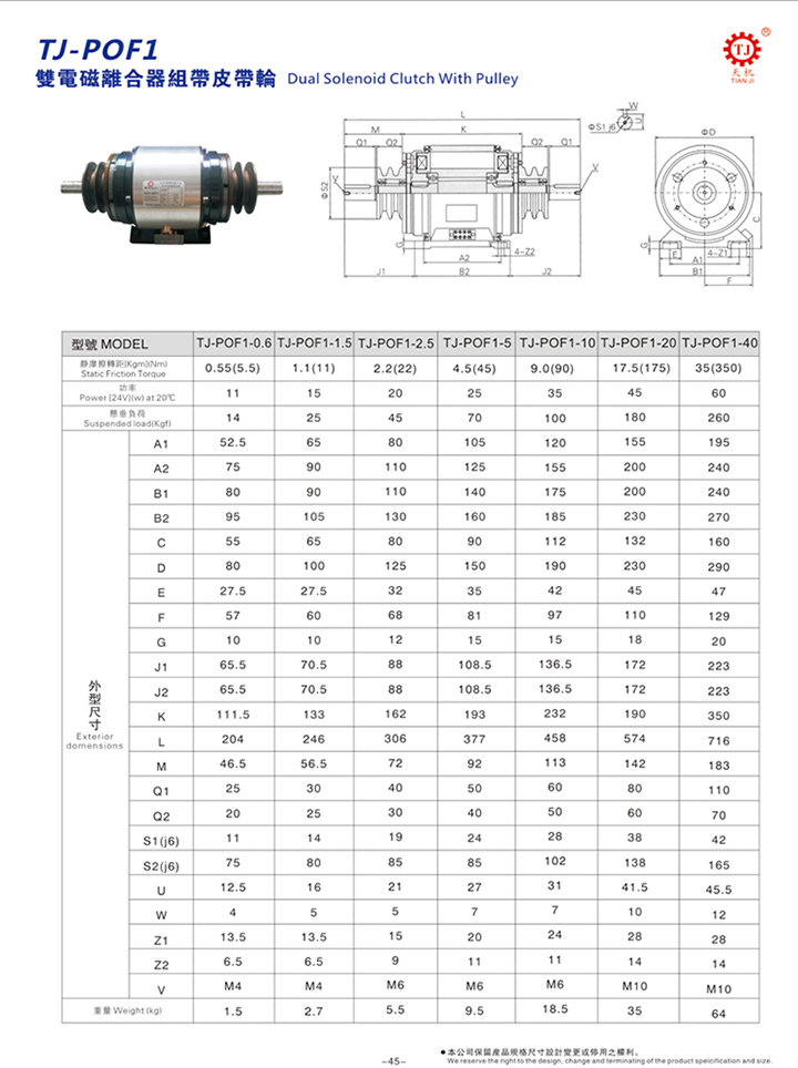 【天機傳動】雙電磁離合器組合體附雙皮帶輪(TJ-POF1),或稱之為雙重電磁離合器組,由兩個TJ-A型摩擦式電磁離合器組成。獨特設計的組合,摩擦部不易磨耗,動作精確、轉動部分慣性小。其工作原理與TJ-POF2型雙電磁離合組一樣,該型雙電磁離合器組合適,常規扭矩 6Nm~400Nm。