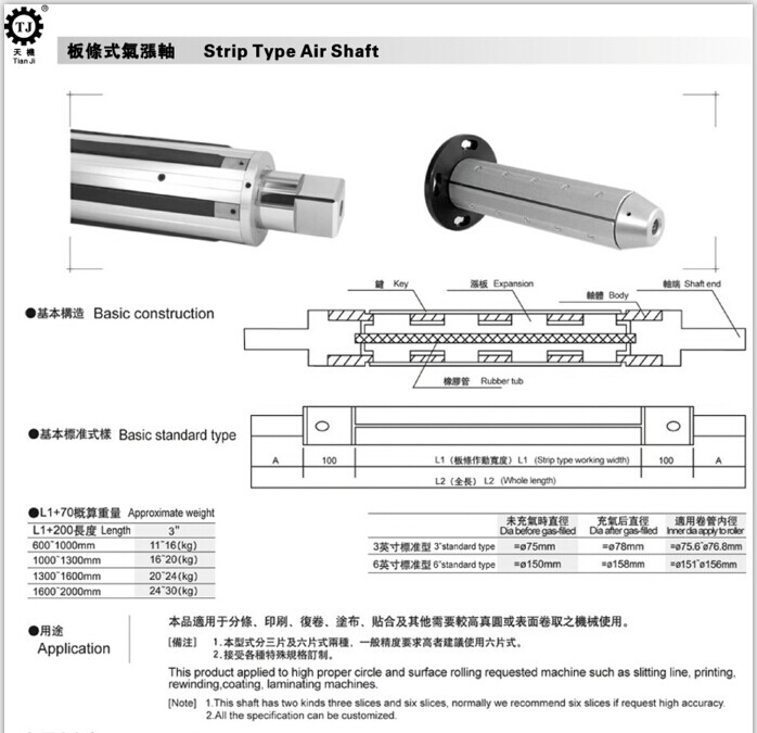 氣脹軸的用途很廣,通常與磁粉離合器、張力控制器配套使用。凡有收卷、放卷、分切的的機(jī)器,都可適用氣脹軸,甚至包括輕金屬行業(yè)。如:氣脹軸主要適用于印刷設(shè)備有:曬板機(jī)、柔印機(jī)、凹板機(jī)、商標(biāo)印刷機(jī)、涂布機(jī)、皮革機(jī)、定型 機(jī)、壓花機(jī)、分條機(jī)、模切機(jī)、復(fù)卷機(jī)、紙筒機(jī)、制袋機(jī)、貼合機(jī)、覆膜機(jī)、無紡布機(jī)、驗(yàn)布機(jī)、燙金機(jī)、電池設(shè)備等等相關(guān)機(jī)械配套之使用。
