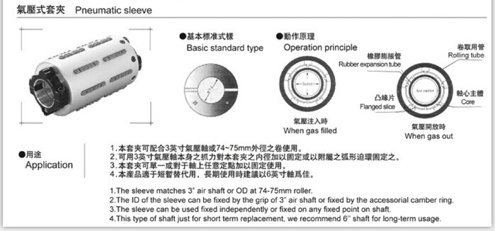 2.紙管放置簡單:以充氣與放氣的動作,可移動及固定紙管在軸面上的任何一個(gè)位置。