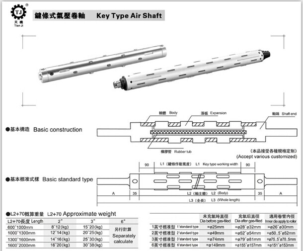用途很廣,凡有收卷、放卷、分切的的機器,都可適用氣脹軸,甚至包括輕金屬行業。天機傳動鍵條式氣脹軸的規格尺寸及參數如下:(具體規格可按客戶要求定制)