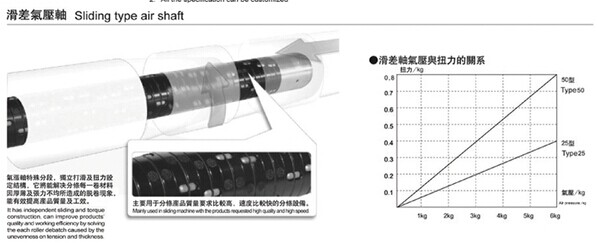 鍵條式氣脹卷軸,鍵式氣壓軸軸生產商(脹氣軸,氣壓軸)適用于扭力及承載重量較高的分條、印刷、復卷、貼合、制袋、造紙或其他相關卷取及發送料的機械配合使用。本型式有45銅及鋁合金兩種,一般承重低于800kg,長度小于1500mm軸,建議使用鋁合金管。